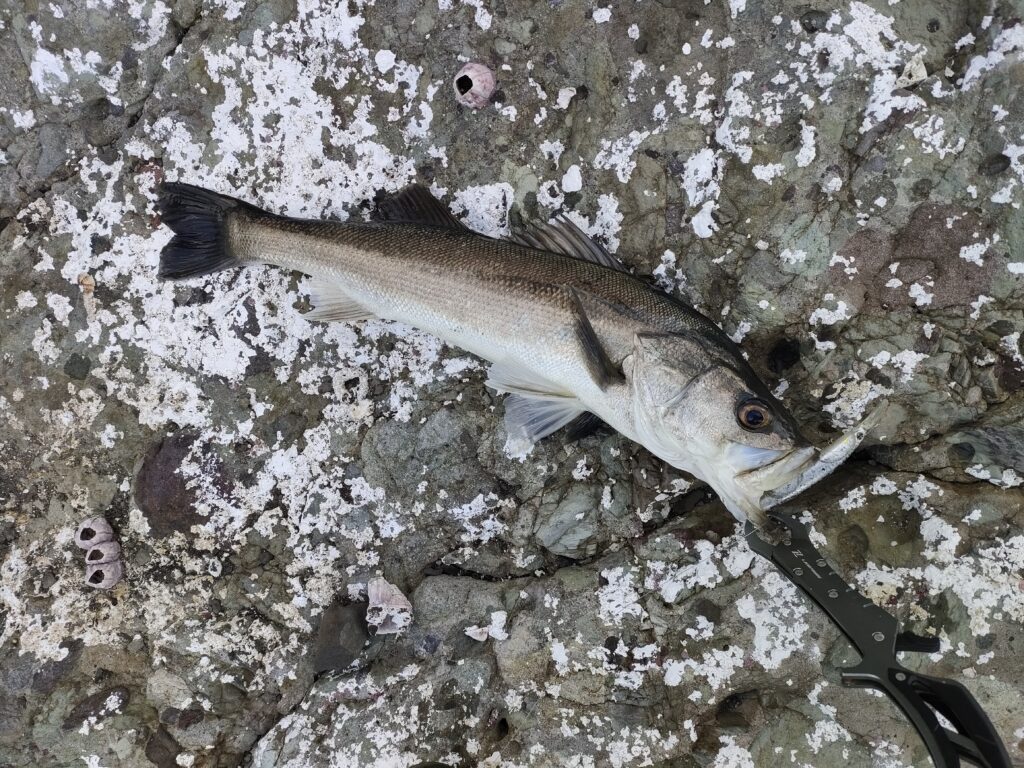 岩礁に囲まれたガチャガチャしたところにセットアッパー125S-DRを通すと、いきなり竿先が引かれ、勢いよくラインが出ていき、なすすべもなくラインブレイク。おそらくヒラマサだと思うが、姿を見れなかったのが悔しい。気を取り直して、サラシのない、沈み根の際にセットアッパー125S-DRを通すとスズキがヒット。引きは強かったのだが、魚体は瘦せていた。しばらく餌をとれずに痩せていったのかもしれない。卵を持っていてもいい時期なのだが、腹を裂くと卵もなく、内臓脂肪も全くない、ところが調理してみると脂はほどよくあり最高に美味しかった。外浦のスズキは何度食べても絶品である。