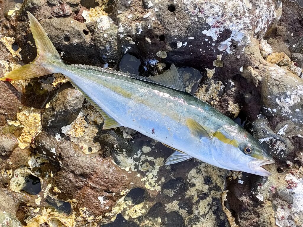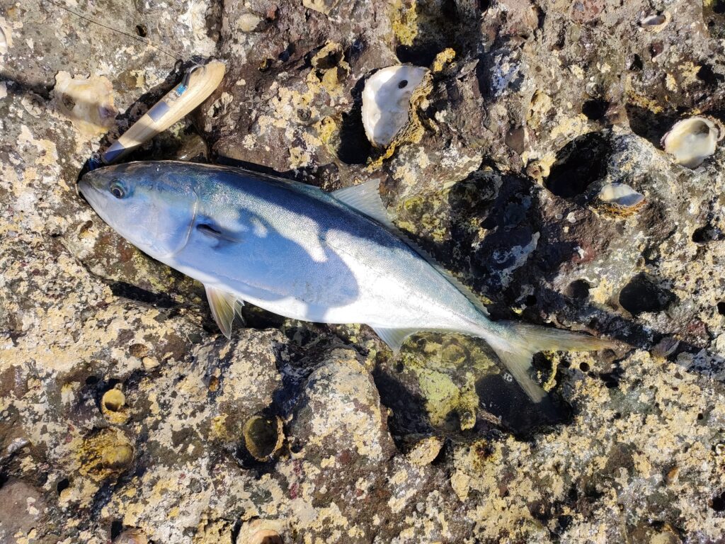 そうしてチューンしたルアーの数キャスト目に魚のチェイスがあり、足元まで追ってきた姿を見るとなんとヒラマサ。その後しばらくキャストを続けると待望のヒット。引きが強く、スピードもあるが、姿を現したのはヒラマサではなく丸々と太ったガンドだった。こんなに太いガンドを釣ったのは初めてで見るからに美味しそう。(後日、食べてみると脂は少なかったが身質と旨味は寒ブリ顔負けの美味しさだった。)