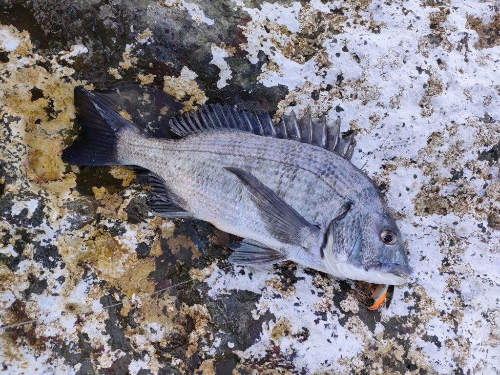 秋は波が立ちやすいので好条件の日を狙いやすい。お気に入りのポイントをランガンすると、75cm程のスズキをキャッチ。続いて磯際を探るとクロダイもヒット。