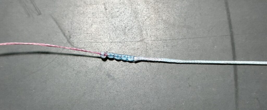 末端からではなく途中から通すのは、後でハーフヒッチをするため。 - PEとリーダーをFGノットで結束